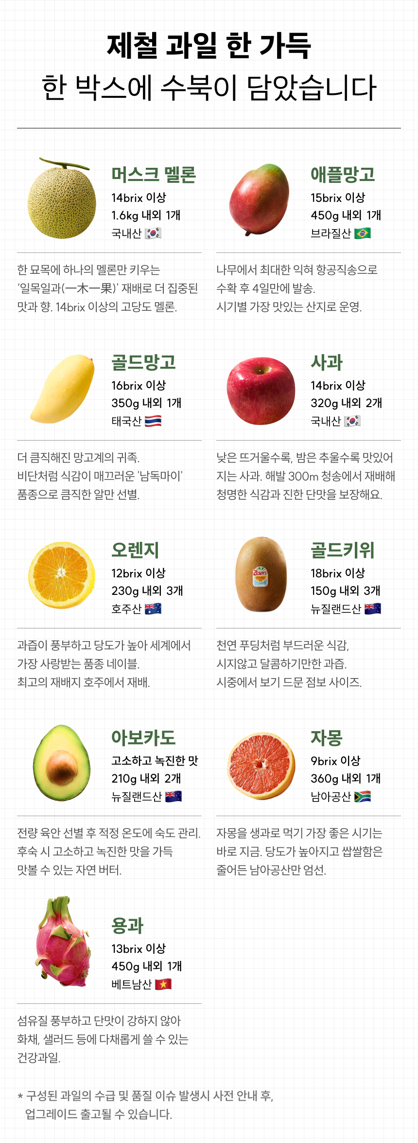 태국 산지 골드망고 수급 이슈로 인하여 사전 안내 후, 애플망고로 업그레이드하여 대체 출고될 수 있습니다.