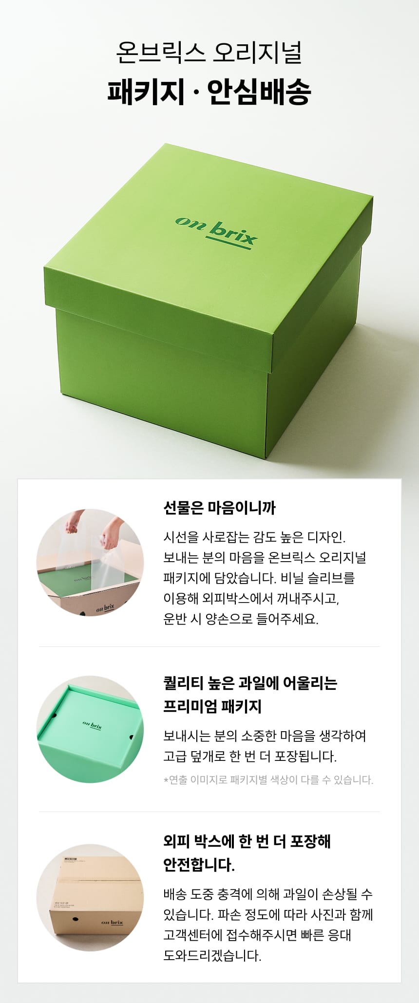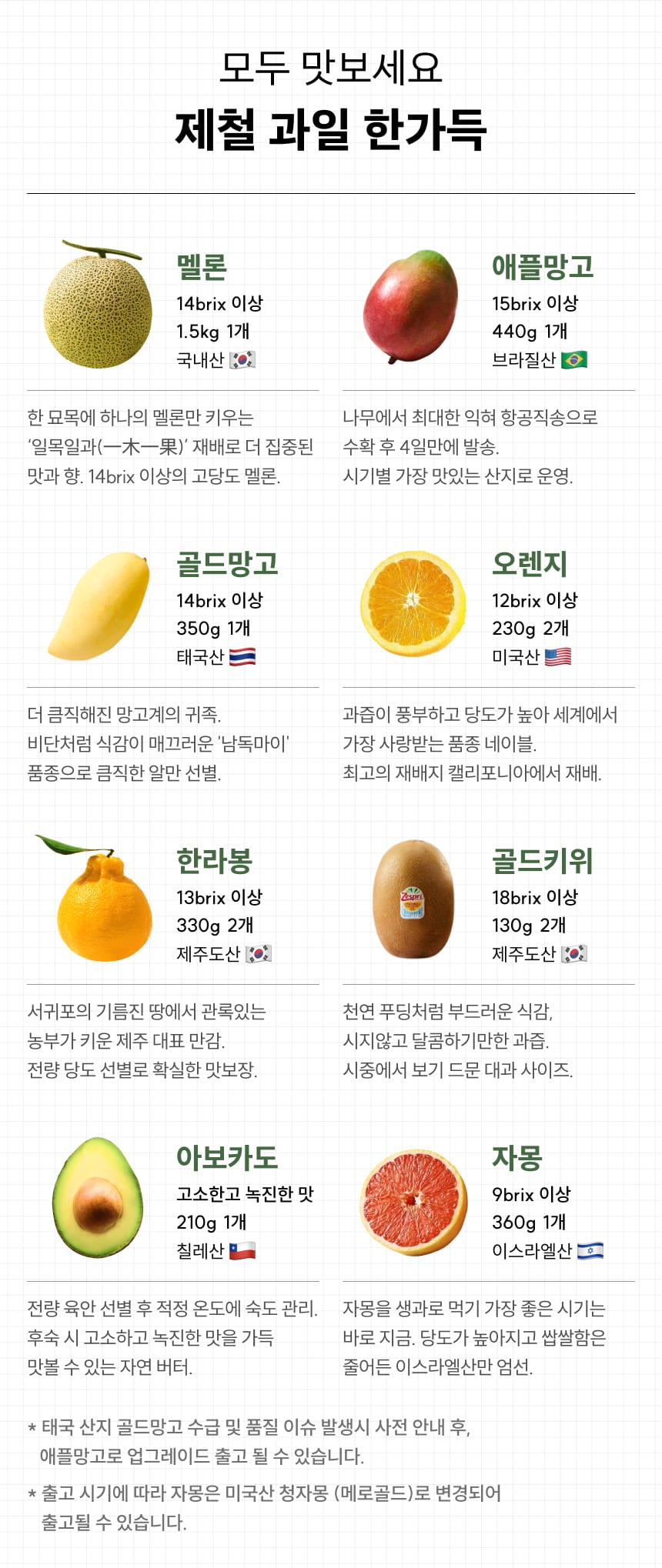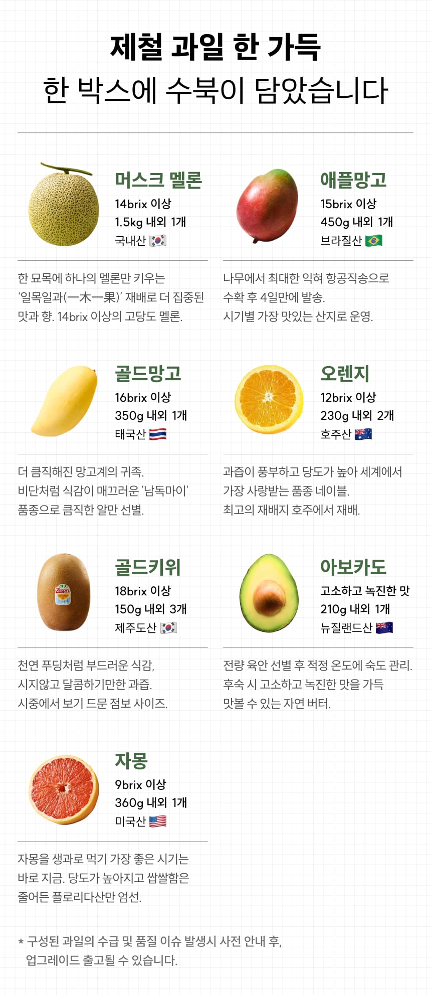 제조연원일/유통기한 | 수입과일 제조연월일 : 포장 전 2일 이내 통관 상품 / 국내산 과일 : 상시수확 / 유통기한 : 신선식품으로 별도의 유통기한이 없습니다. 빠른섭취 부탁드립니다. |