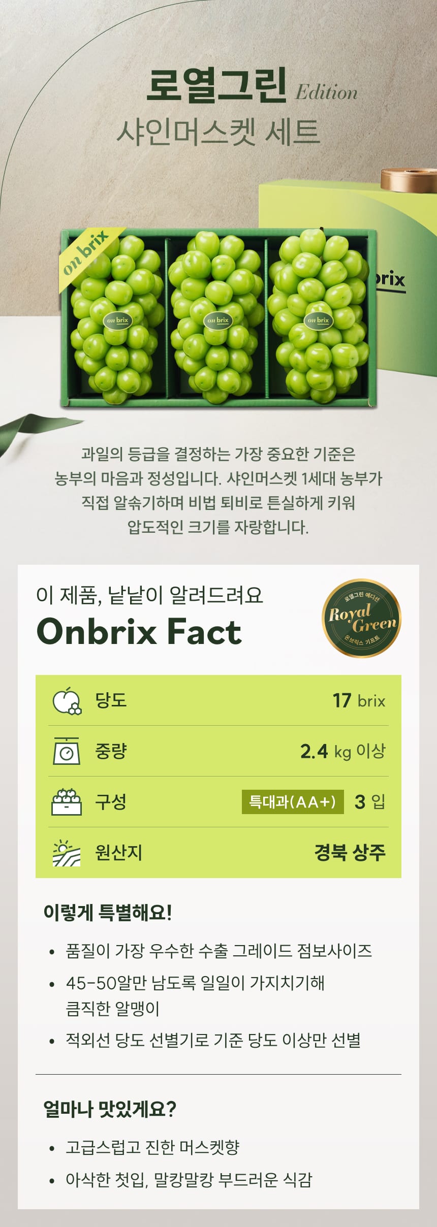 • 016 [설 선물] 로열그린 에디션, 프리미엄 특대 샤인머스켓 선물세트 2.4kg이상(3송이/특품)