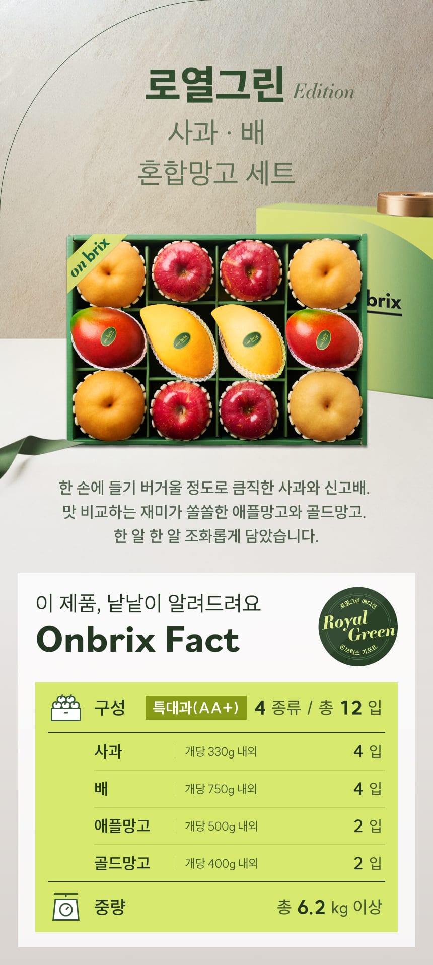 [새벽에On] 로열그린 에디션, 사과&배&혼합망고 선물세트 6.2kg이상(12입/특품)