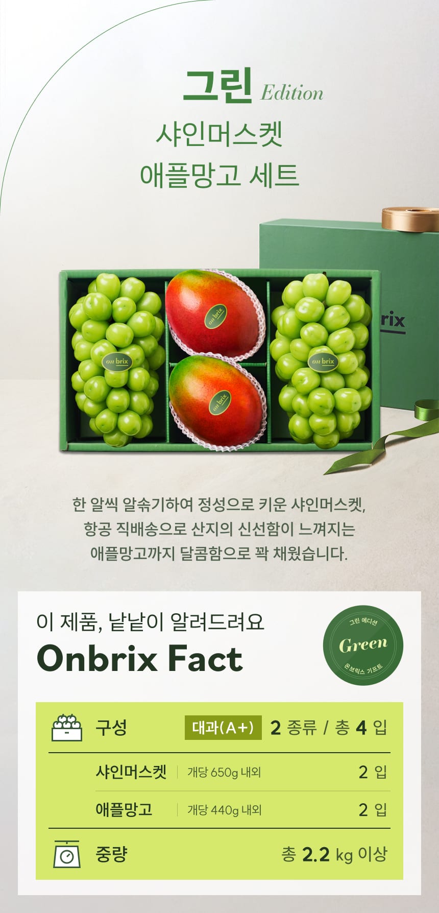 [산지직송] 그린 에디션, 애플망고&샤인머스켓 선물세트 2.2kg이상(4입/특품)
