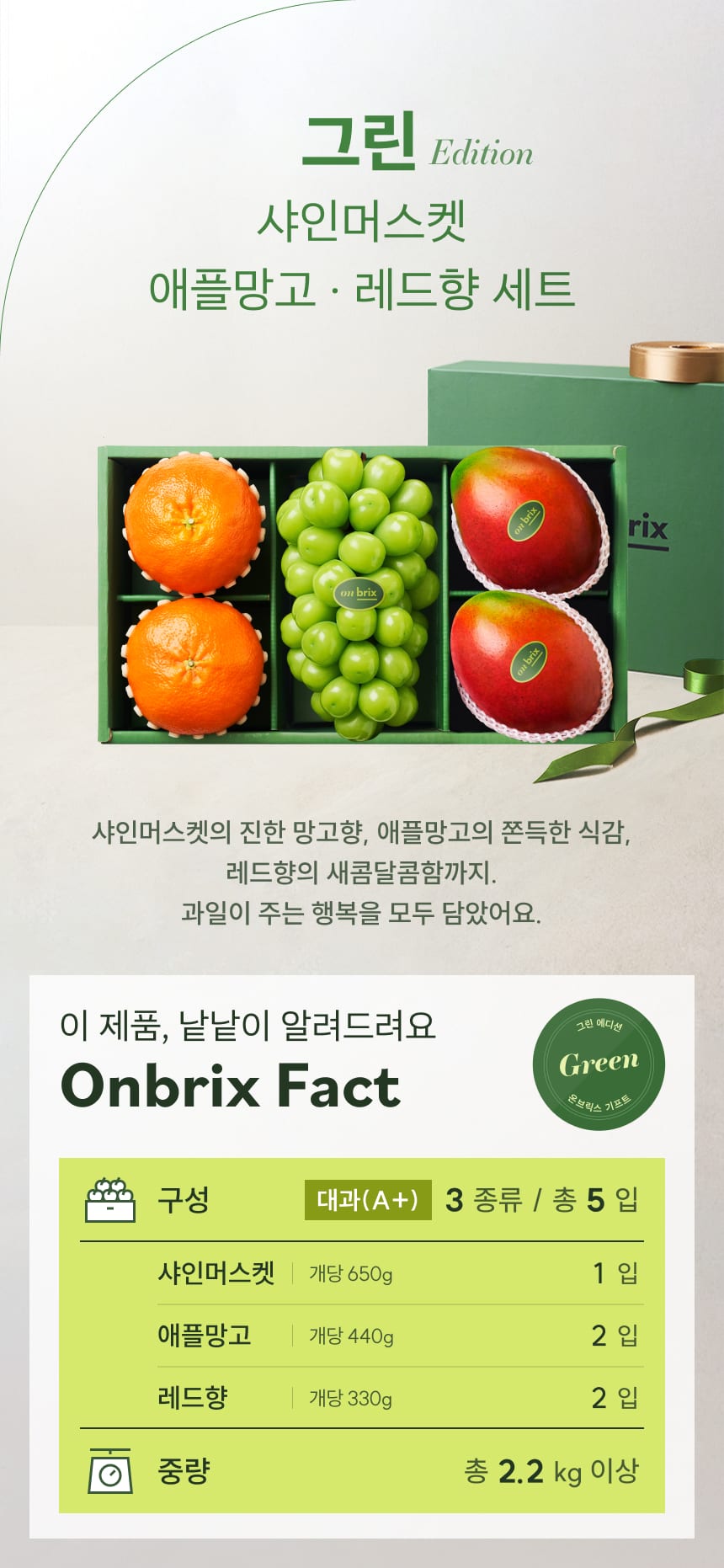 032 [설 선물] 그린 에디션, 프리미엄 샤인머스켓&애플망고&레드향 선물세트 2.2kg이상(5입)