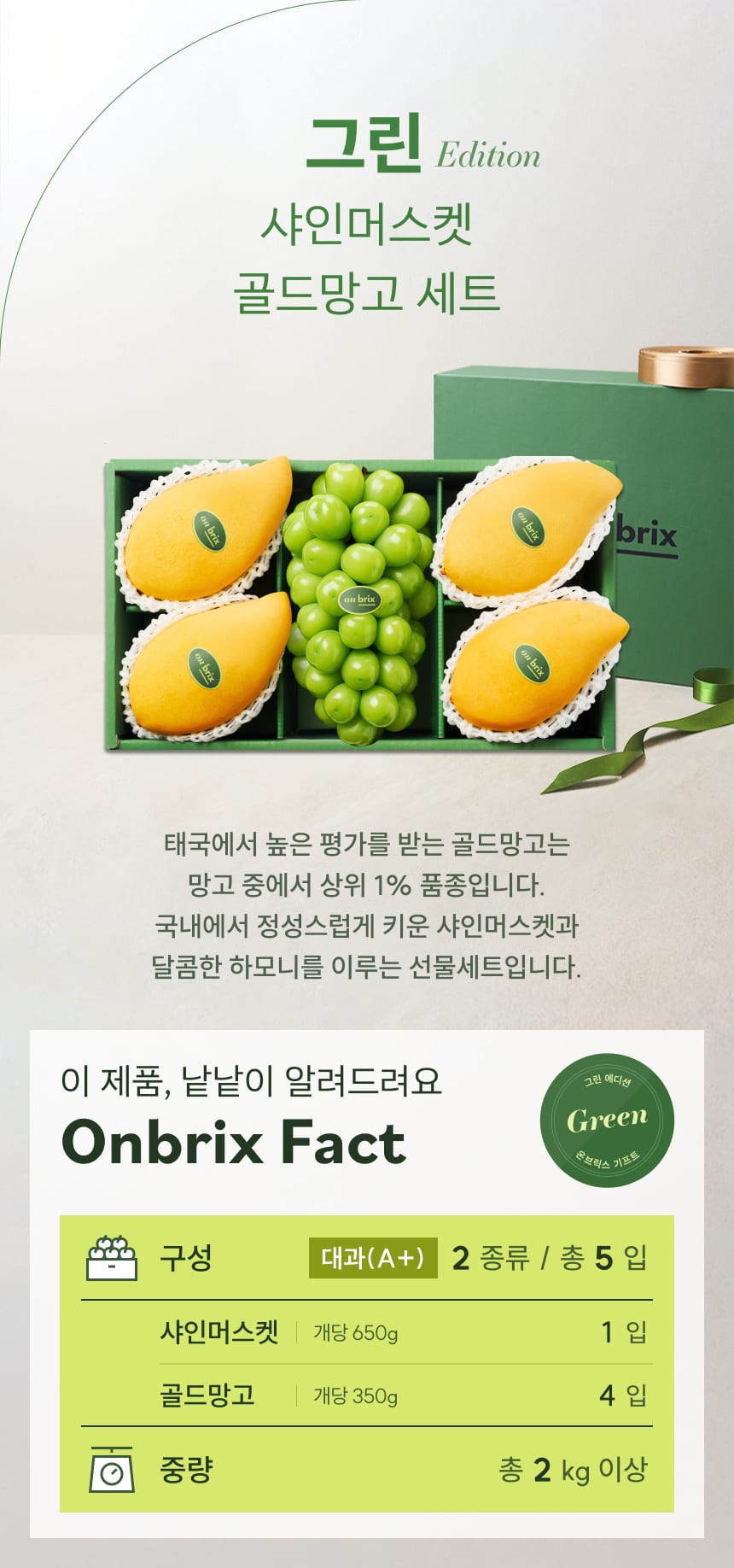 128 [설 선물] 그린 에디션, 프리미엄 샤인머스켓&골드망고 선물세트 2kg이상(5입)