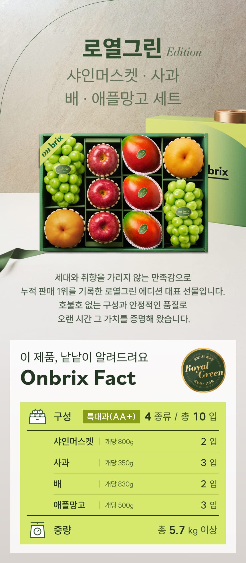 004 [설 선물] 로열그린 에디션, 샤인머스켓&사과&배&애플망고 선물세트 5.7kg이상(10입/특품)