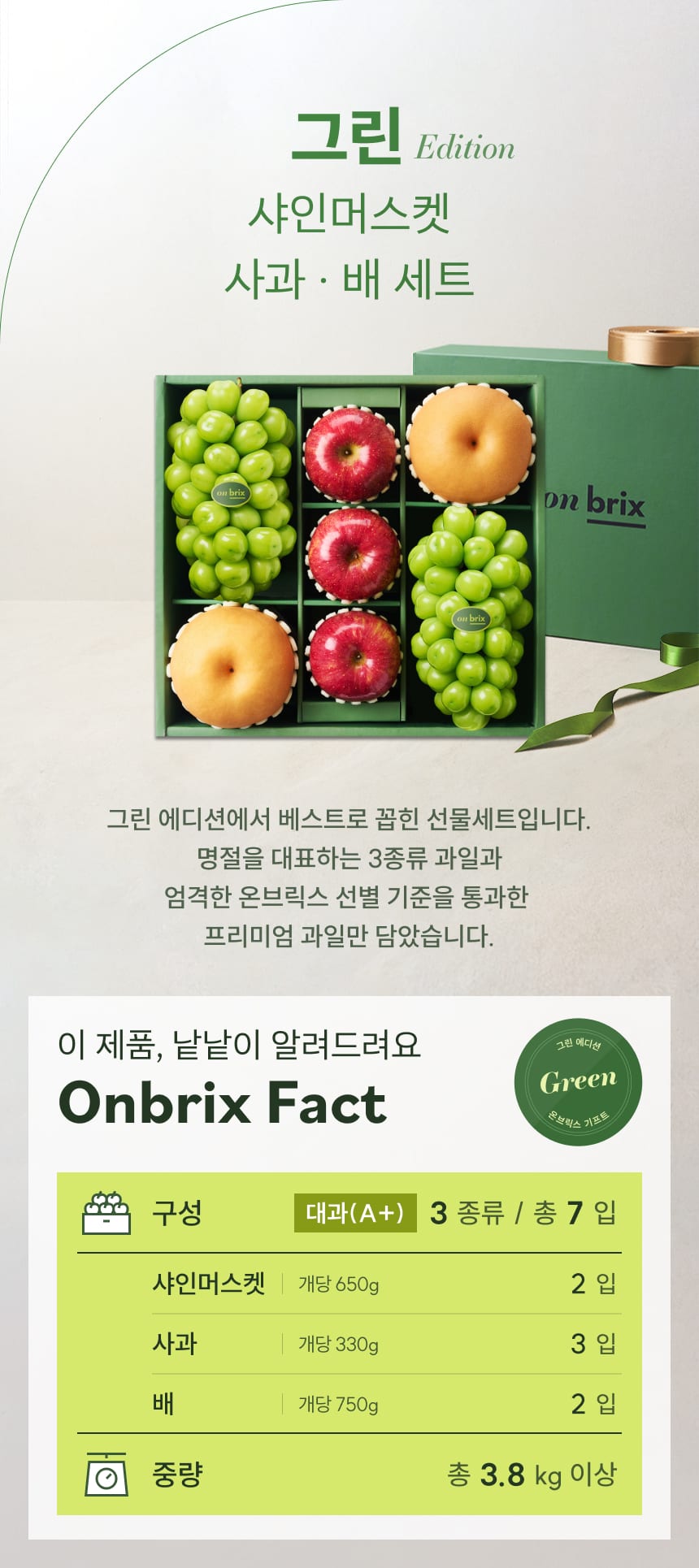 018 [설 선물] 그린 에디션, 프리미엄 샤인머스켓&사과&배 선물세트 3.8kg이상(7입/특품)