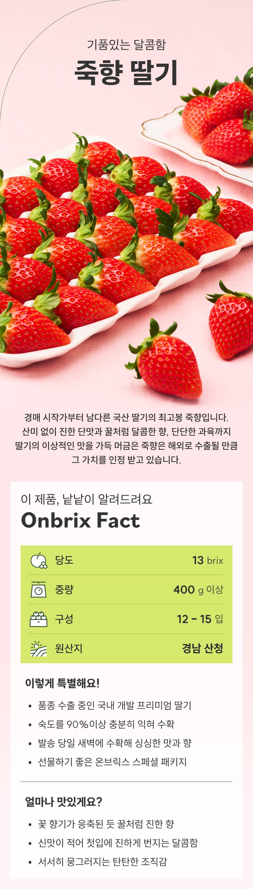 [100개 한정수량] 꿀처럼 달콤한, 프리미엄 산청 죽향 딸기 400g이상(12-15과/특품)