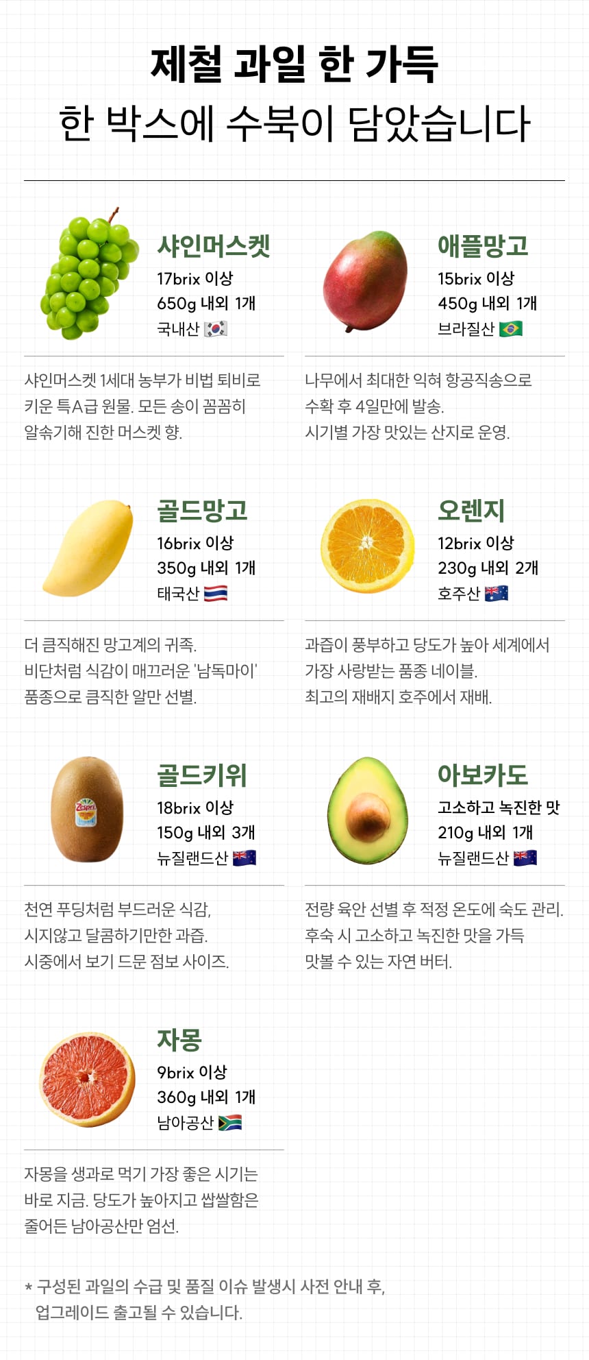 태국 산지 골드망고 수급 이슈로 인하여 사전 안내 후, 애플망고로 업그레이드하여 대체 출고될 수 있습니다.