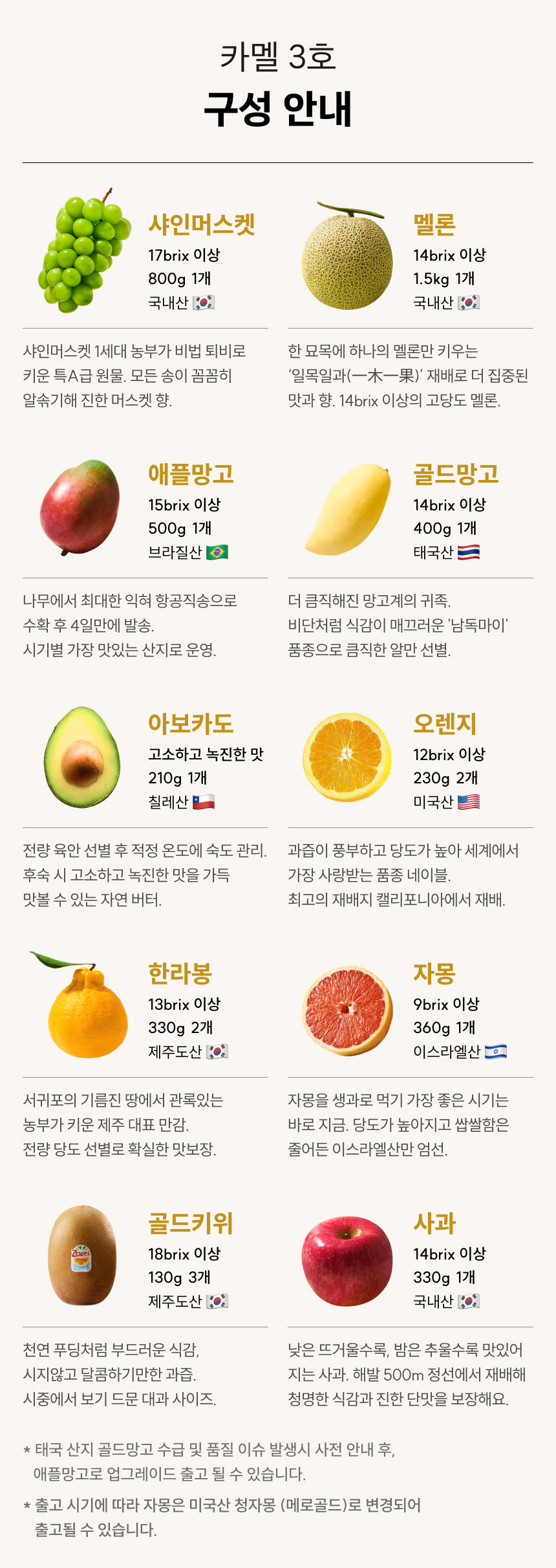 제조연원일/유통기한 | 수입과일 제조연월일 : 포장 전 2일 이내 통관 상품 / 국내산 과일 : 상시수확 / 유통기한 : 신선식품으로 별도의 유통기한이 없습니다. 빠른섭취 부탁드립니다. |