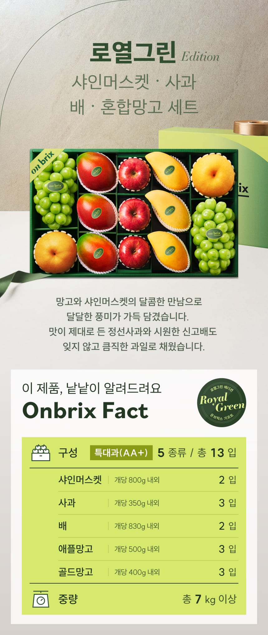 [새벽에On] 로열그린 에디션, 샤인머스켓&사과&배&혼합망고 선물세트 7kg이상(13입/특대형)