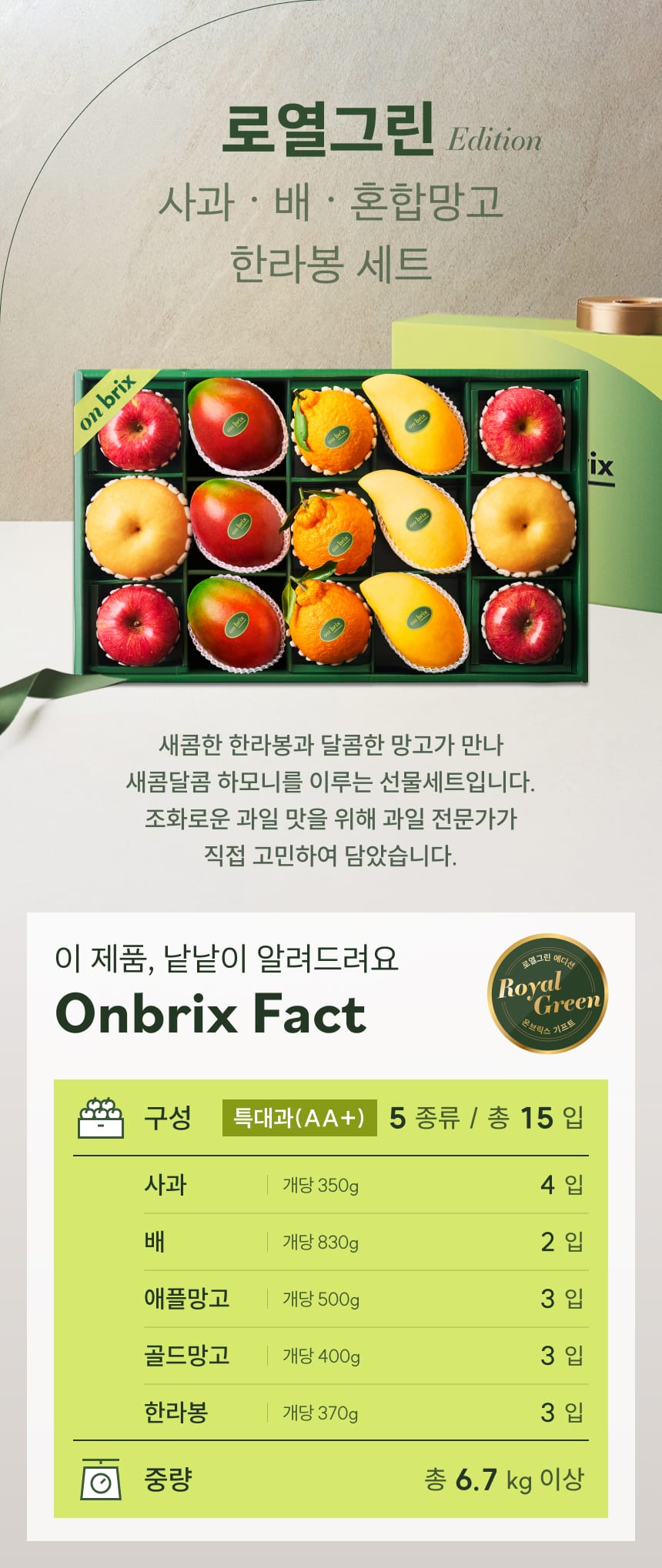 003 [설 선물] 로열그린 에디션, 사과&배&한라봉&혼합망고 선물세트 6.7kg이상(15입/특대형)