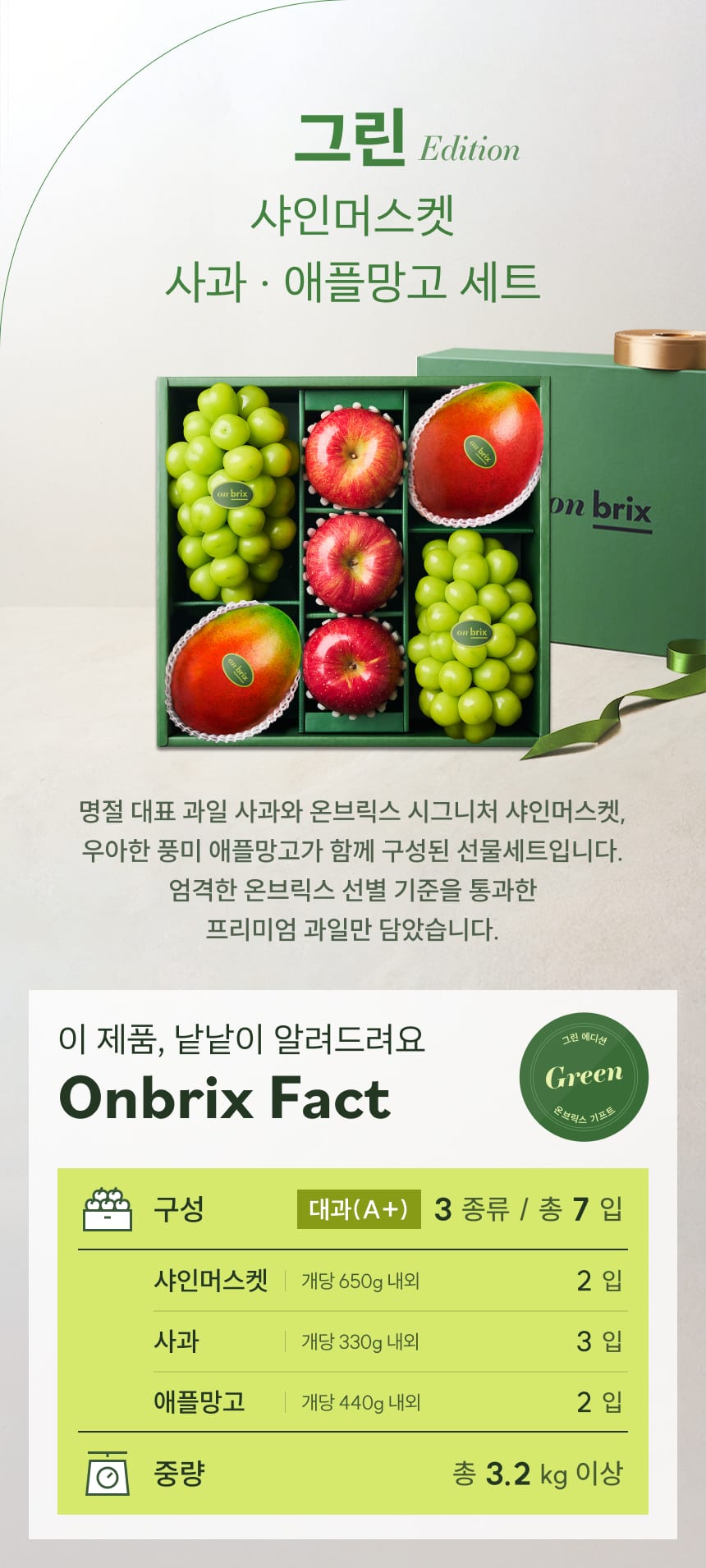 [새벽에On] 그린 에디션, 샤인머스켓&사과&애플망고 선물세트 3.2kg이상(7입/특품)